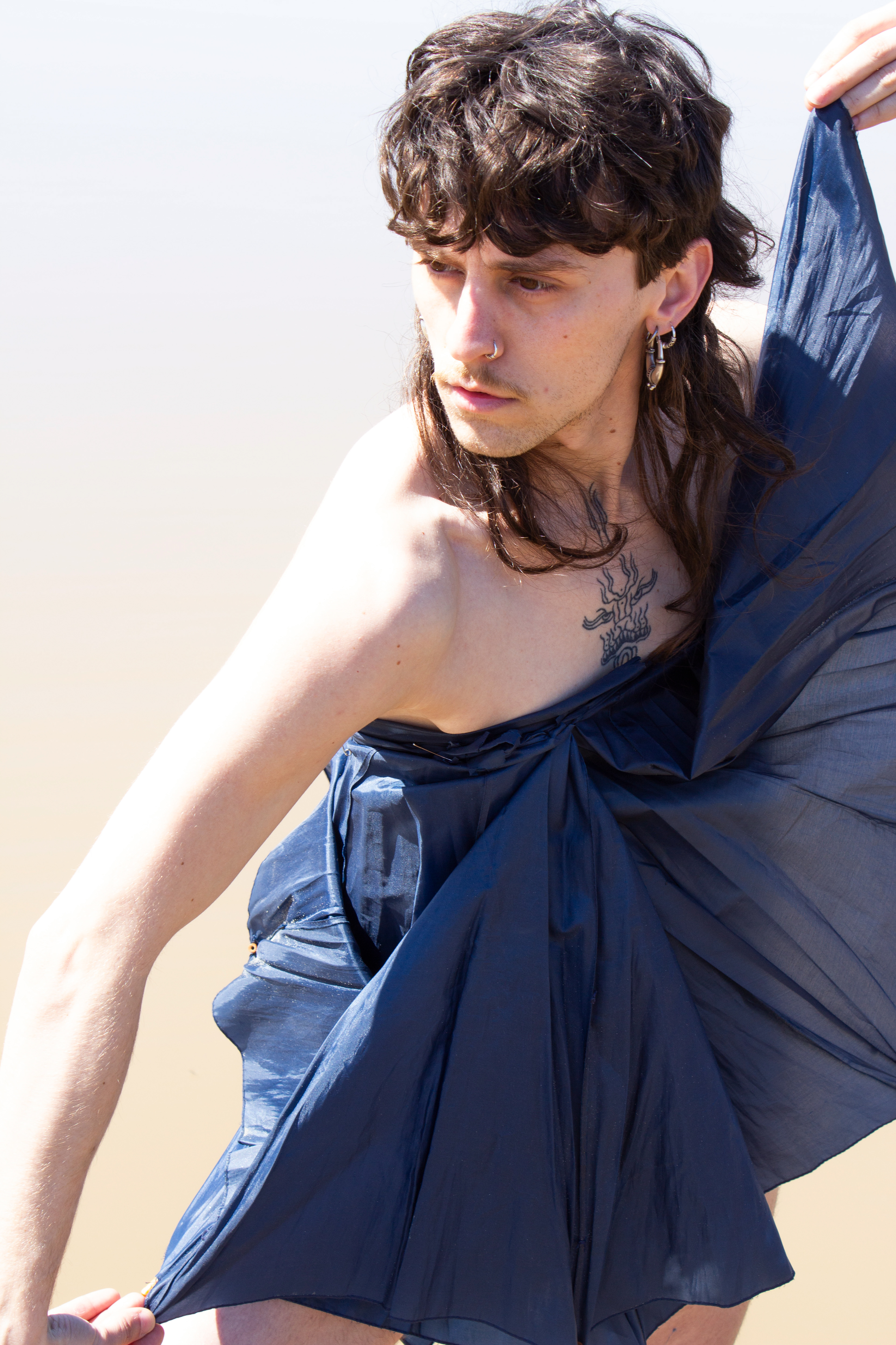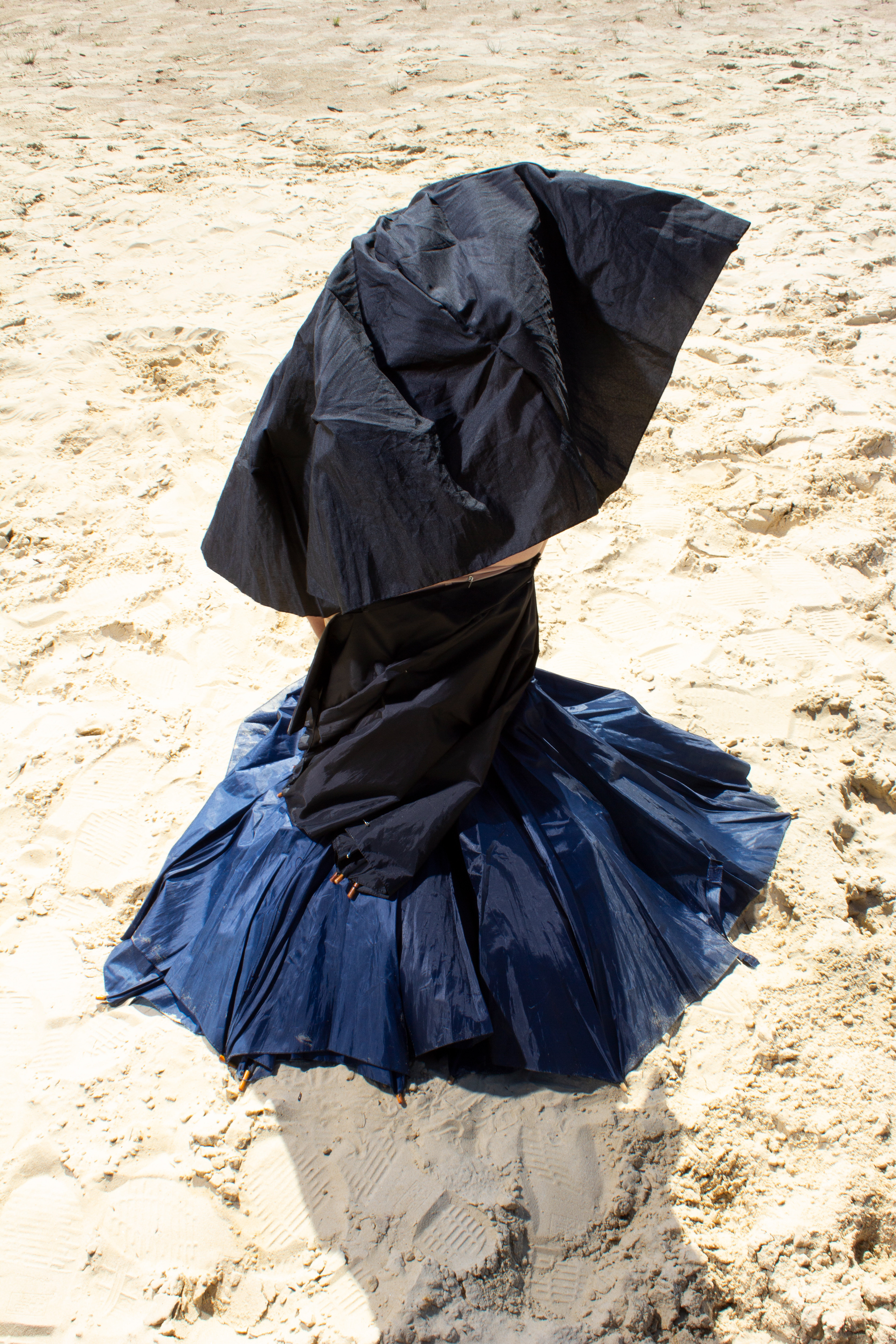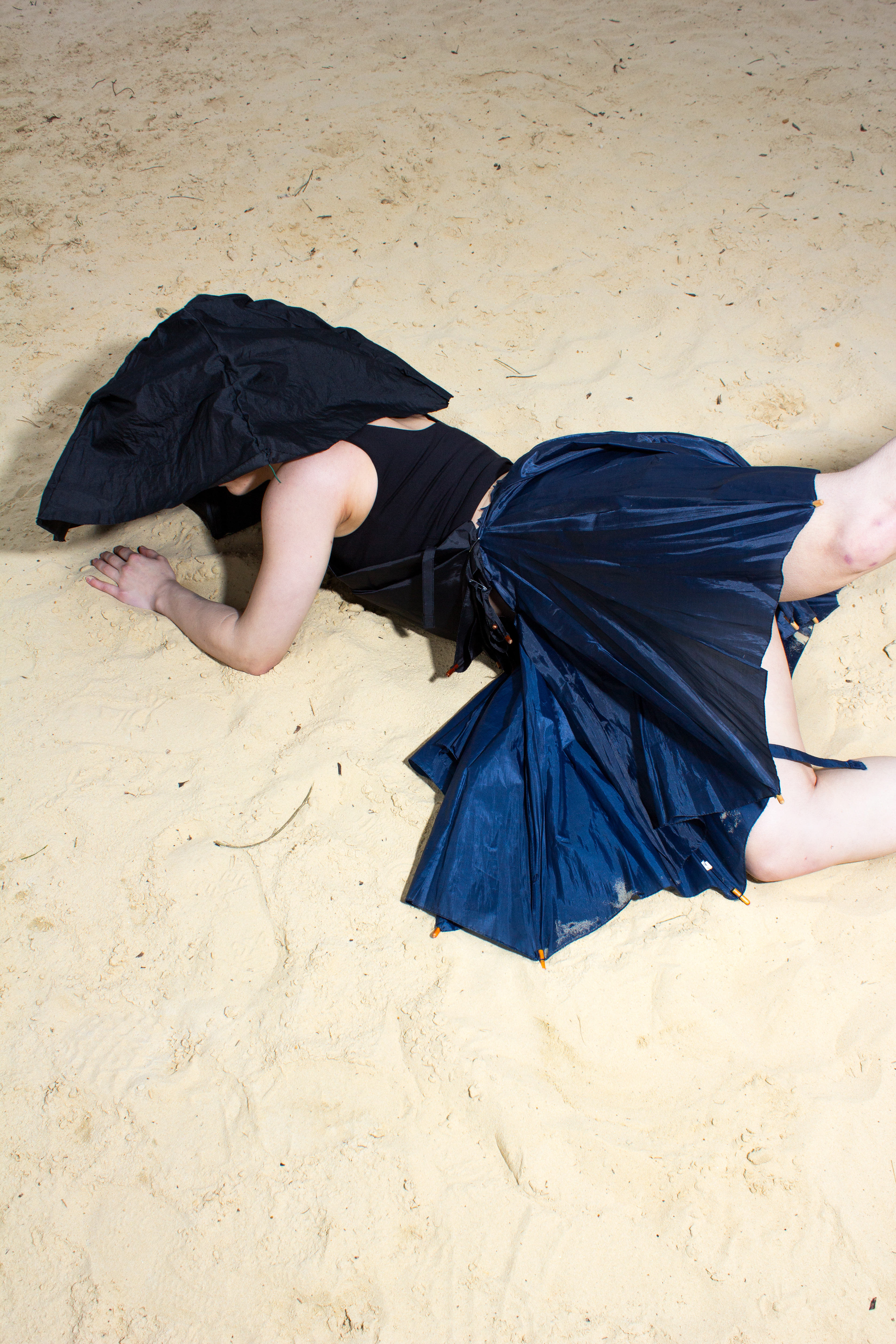 In Icarian, the story of Icarus symbolizes overconsumption and fast fashion. The series portrays the character’s transitional phase between dystopia and utopia, as they attempt to float between land and sea to maintain balance. Fashion and the dancer's body is used as a sculpture: the outfit is made from umbrella fabric, with the wing-like silhouette visualizing a connection to the myth of Icarus. If we keep on flying on the wings of fast fashion, we will inevitably crash in the ocean and the remaining materials will melt. Therefore, the sollution is sustainable fashion, where the sea meets the land.