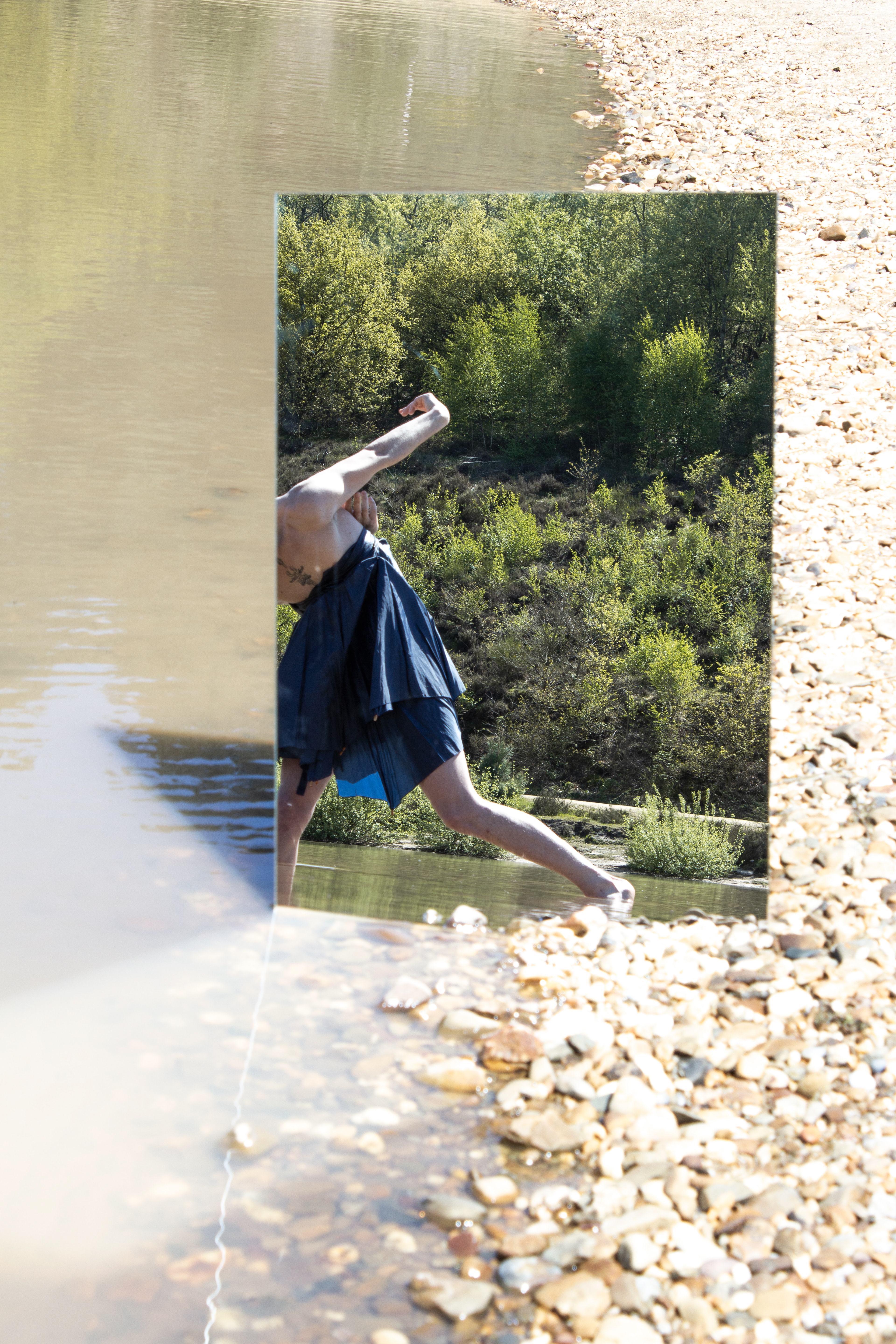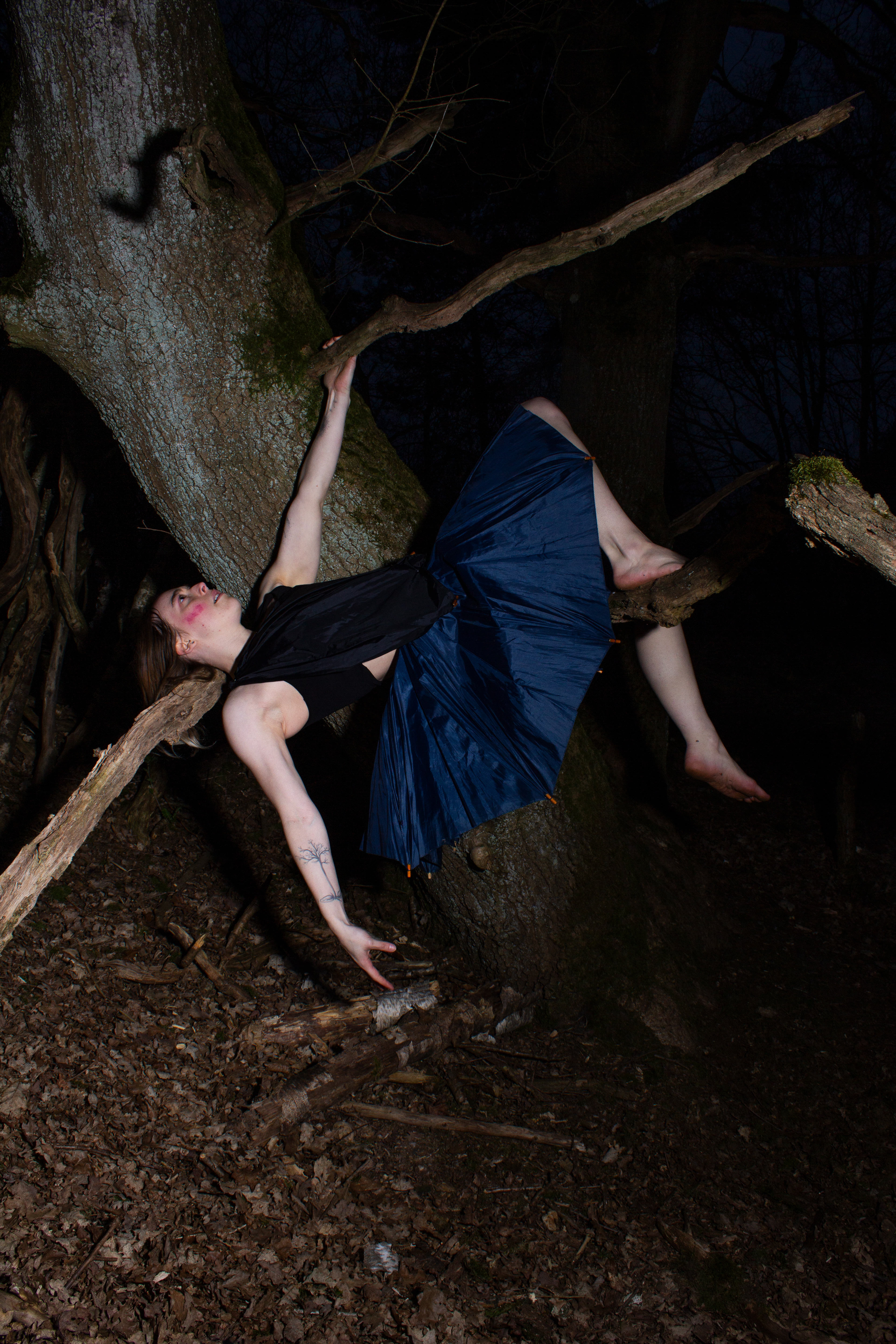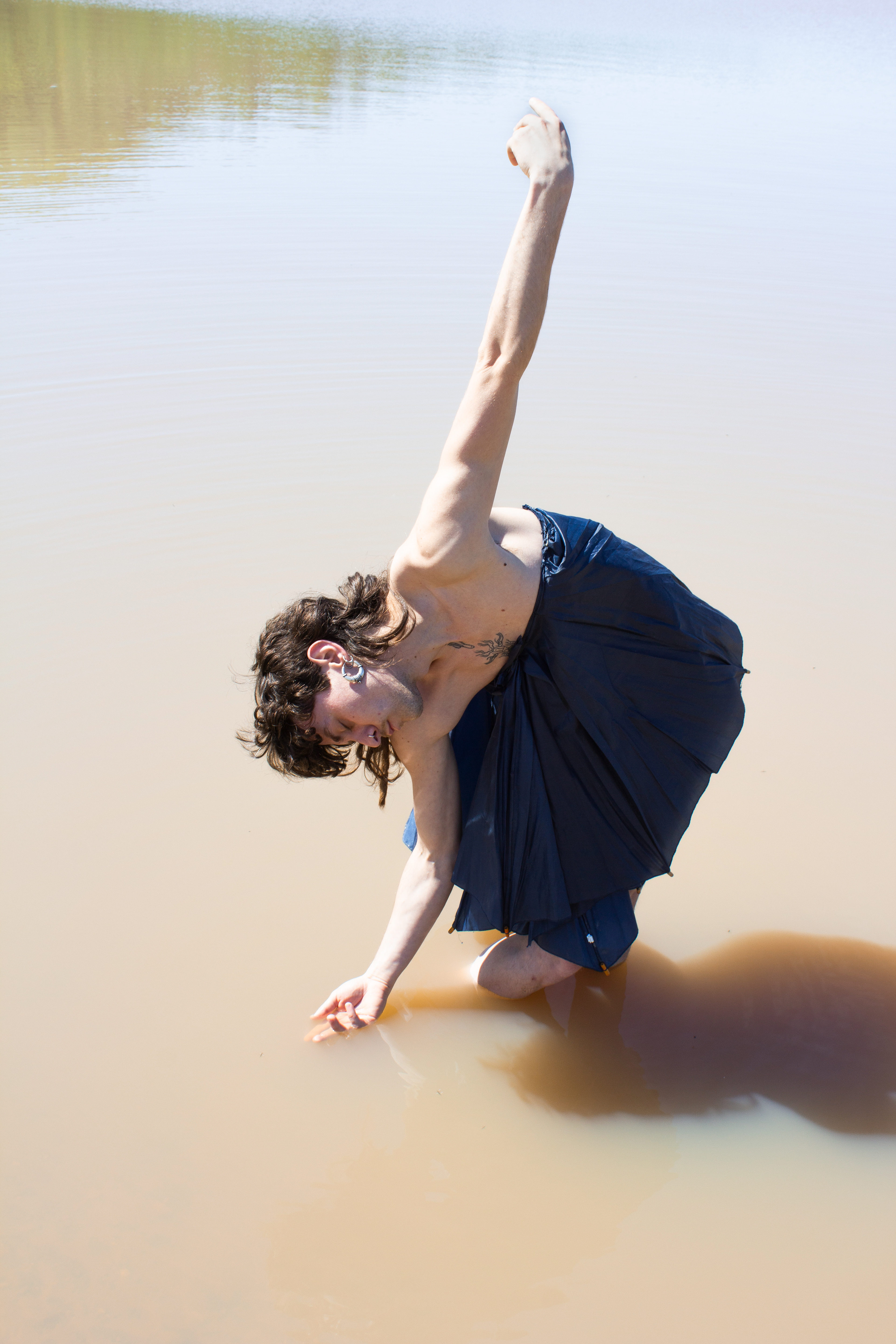 In Icarian, the story of Icarus symbolizes overconsumption and fast fashion. The series portrays the character’s transitional phase between dystopia and utopia, as they attempt to float between land and sea to maintain balance. Fashion and the dancer's body is used as a sculpture: the outfit is made from umbrella fabric, with the wing-like silhouette visualizing a connection to the myth of Icarus. If we keep on flying on the wings of fast fashion, we will inevitably crash in the ocean and the remaining materials will melt. Therefore, the sollution is sustainable fashion, where the sea meets the land.