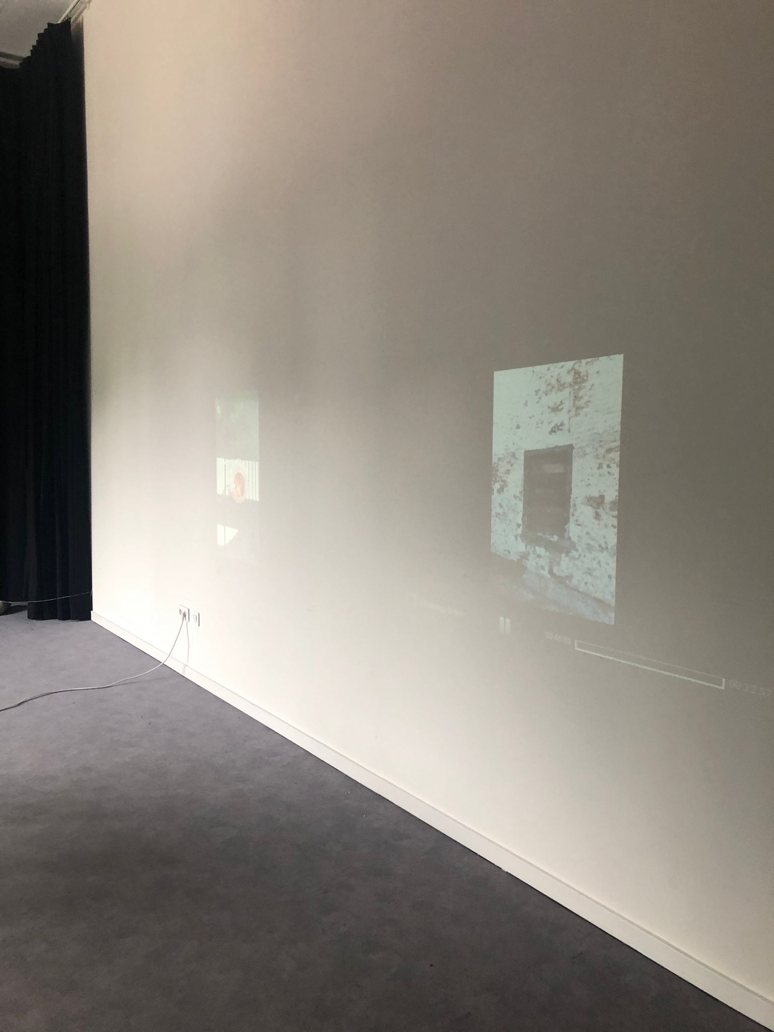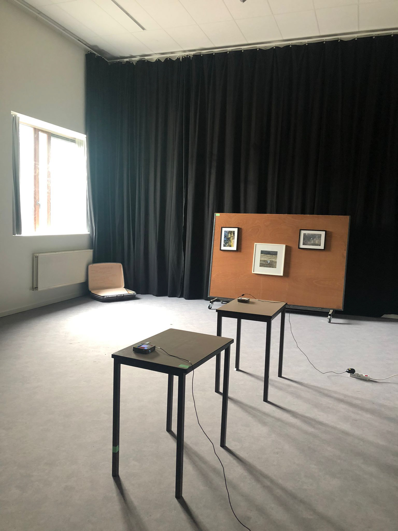 I presented the work in one room, like a mini exhibition. The videos were shown as a projection and the photographs were hung in frames on an extra wooden wall. The curtains were a back drop for the installations. The lightning in the room wasn't perfect of course and yet again the quality could have been better, but it was the first time for me to present my work like this with a jury.
